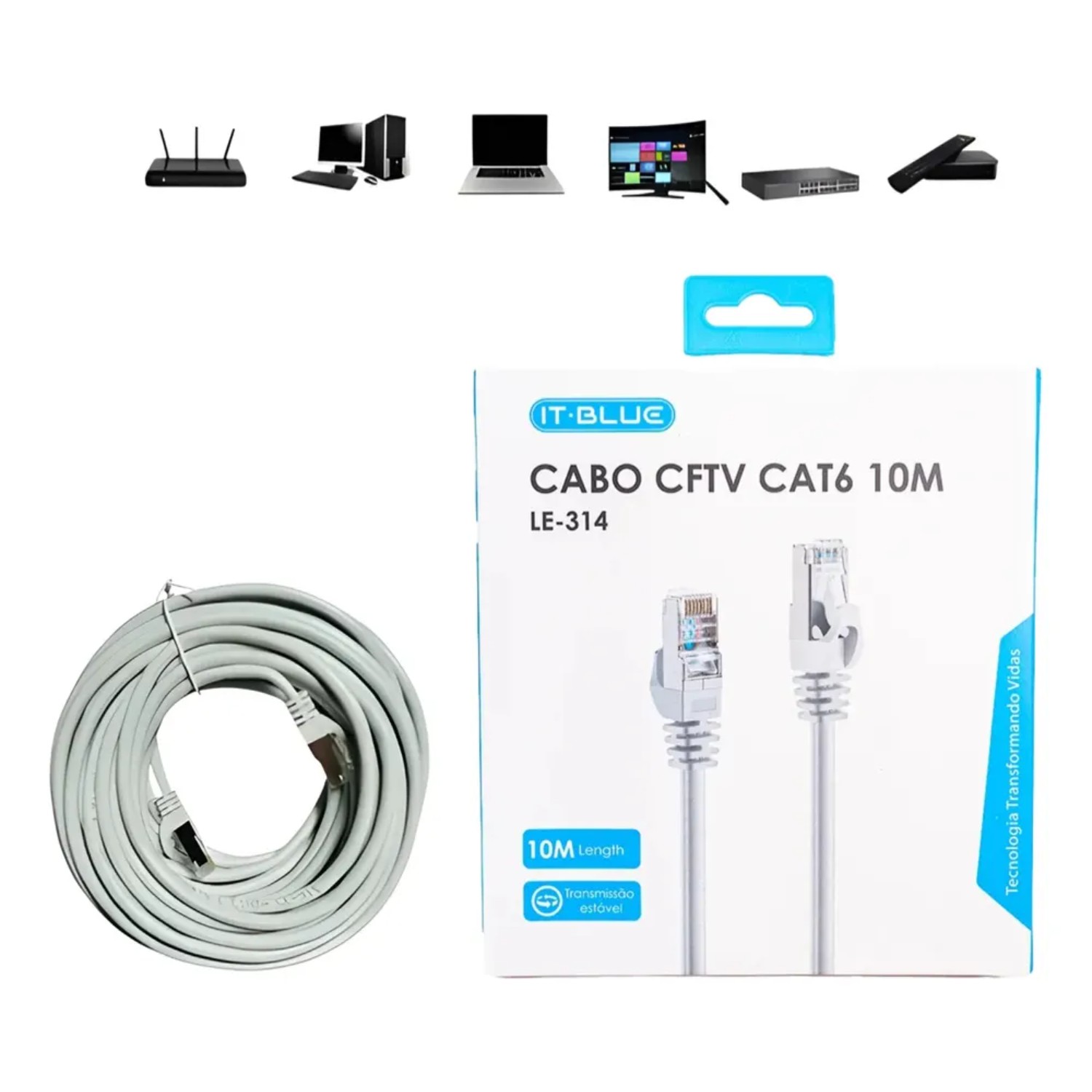 Cabo de Rede CAT6, pontas RJ45 com transmissão estável, ideal para uso em redes e sistemas de CFTV, possui condutor composto por múltiplos fios assegurando excelente confiabilidade e estabilidade em seu uso, quatro pares precisamente torcidos aumentam a estabilidade da transmissão de sinal. Com Conector banhado a ouro propicia uma melhor condução de dados, disponível na cor cinza. Aplicações: câmeras IP, computadores e switches, hubs, ADSL, roteadores, set-top boxes digitais, TVs com recursos de rede, terminais de design de redes sem fio, etc. INFORMAÇÕES TÉCNICAS Marca: It-Blue / Modelo: LE314 Comprimento: 10 metros Tipo: CAT6 Conector: RJ45 (2 conectores) Característica do Conector: Banhado a Ouro Cor: Branco Acinzentado Conteúdo da Embalagem 1 Cabo de Rede CAT6 10 Metros – LE314 1 Caixa/embalagem Obs.: As fotos do anuncio são meramente ilustrativa, as cores podem variar de tonalidade conforme as configurações do seu monitor ou tela. A tonalidade da cor do LED pode ser ligeiramente diferente das fotos. Obs.: Todos os produtos são examinados antes do envio, ao receber o produto o usuário deve operá-lo de acordo com as especificações do anuncio, embalagem, manual ou informações do fabricante.