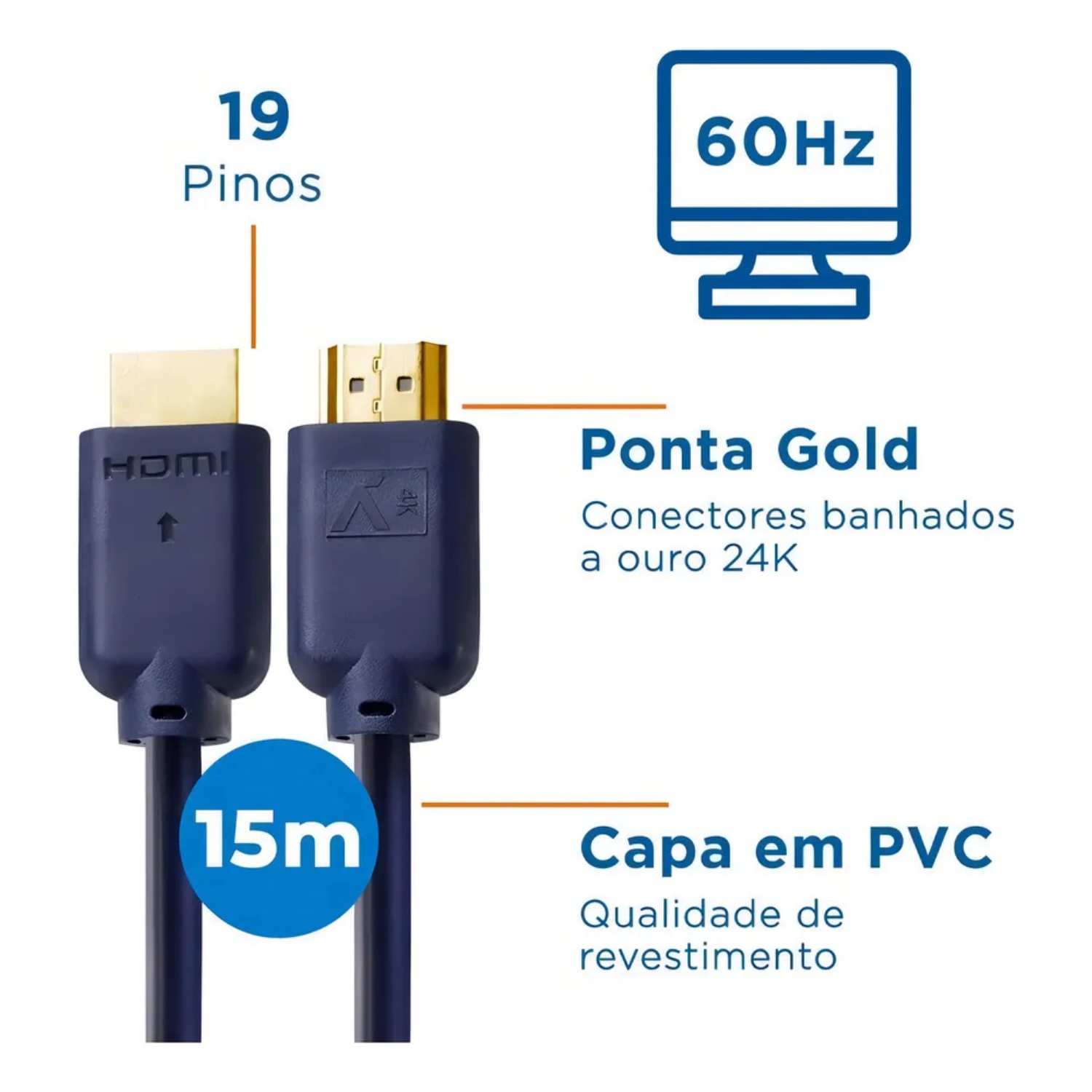 1x Cabo HDMI 2.0 15 Metros Blindado com Ponteira Gold