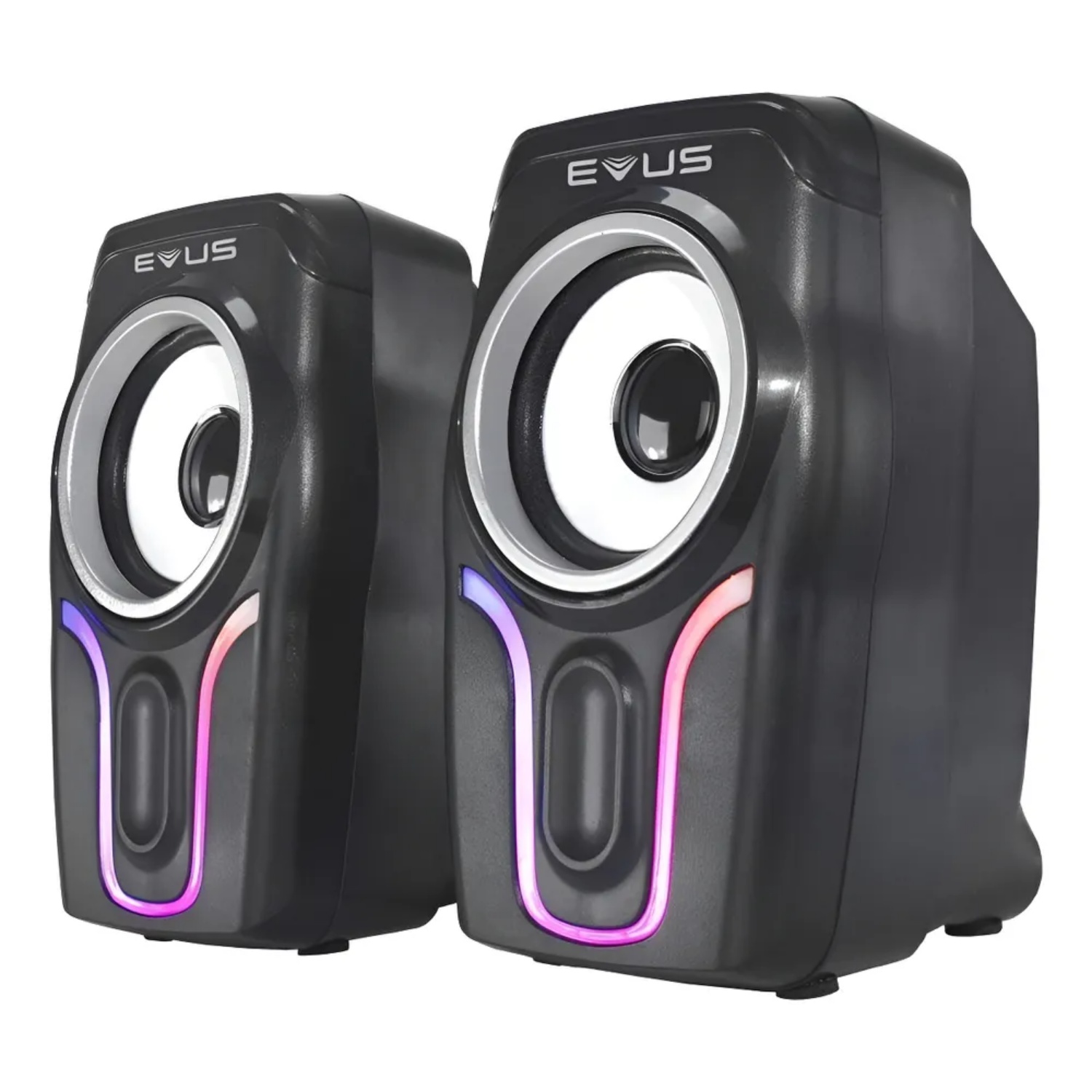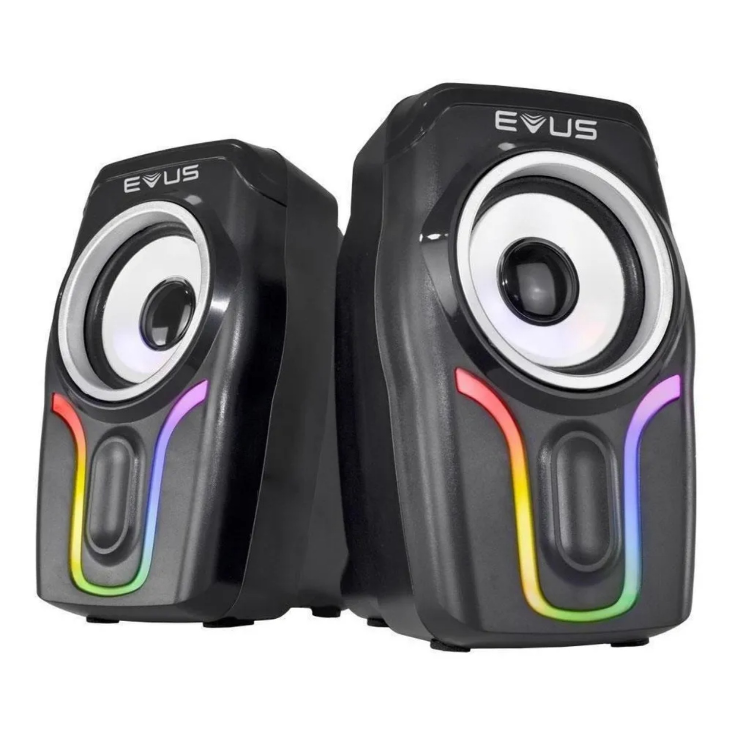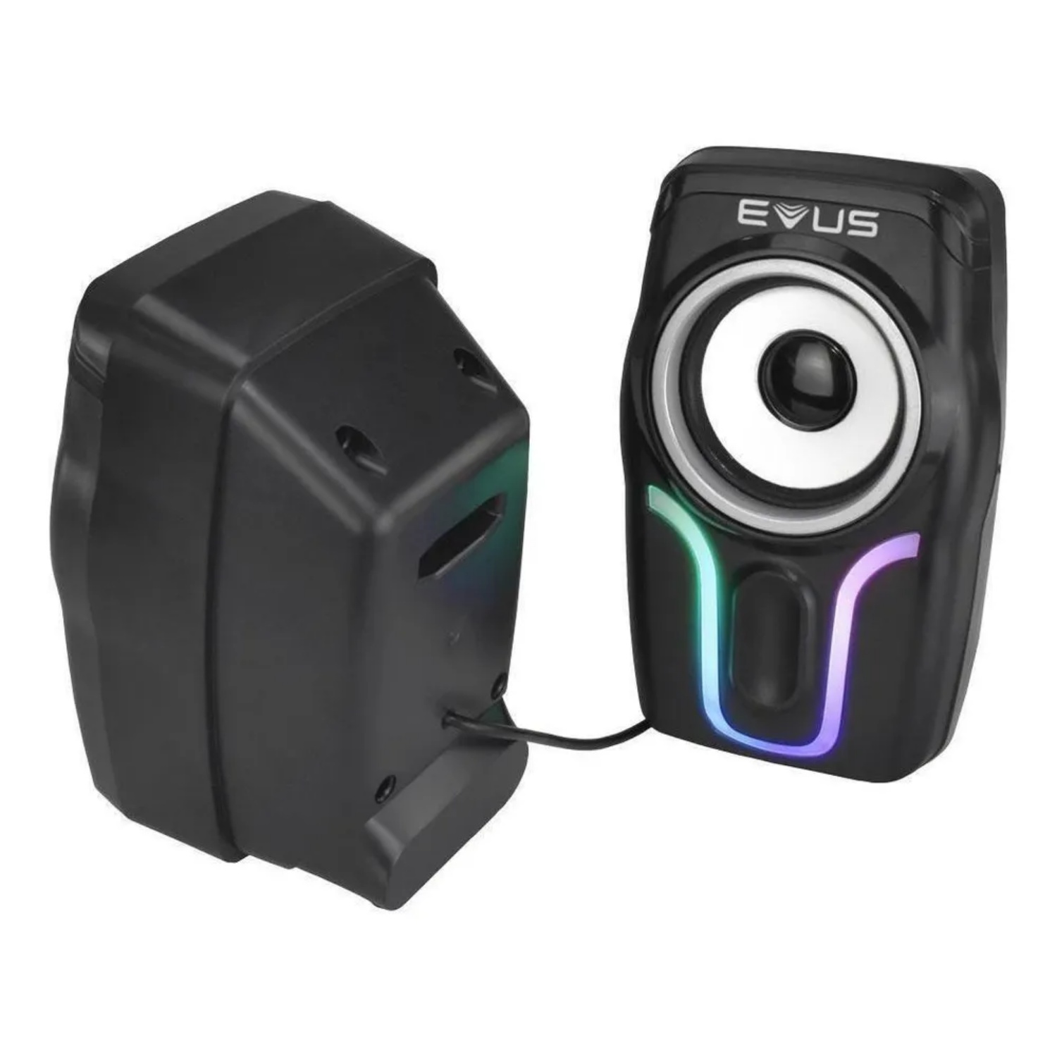 Caixa De Som Evus As-225d Color Wave A Caixa de Som Evus AS-225D Color Wave é o produto perfeito para quem busca qualidade de áudio mas não abre mão do estilo gamer, pois conta com 5 modos de iluminação RGB para combinar com o seu setup, que podem ser acessados através do controle presente no cabo, além de permitir também fácil acesso à regulagem do nível de volume. Os alto-falantes com potência total de 6W RMS de alta qualidade proporcionam um som limpo e nítido. Utilize o plug P2 (3.5mm) para reproduzir áudio e a conexão via USB para a alimentação de energia. A Caixa de Som Evus AS-225D Color Wave é a companhia perfeita para uma imersão completa na sua maratona de jogos.