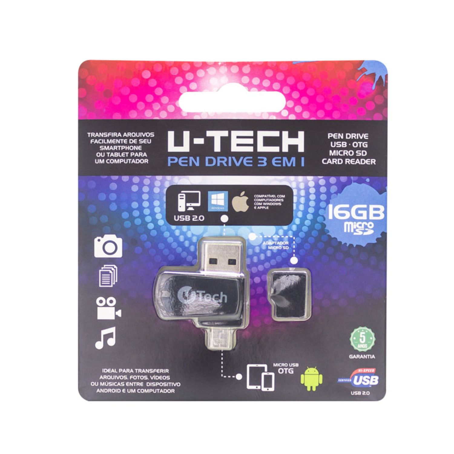 Características: - Marca: U-Tech - Modelo: PDOTG Especificações: - Capacidade: 16GB - 3 em 1: Adaptador Micro SD, Micro USB e pendrive - Velocidade de transferencia de dados: 5MB/s escrita e 15MB/s leitura - Conexão: USB 2.0 - Cor: Preto - Compatível com Windows e Mac iOS Peso c/ Embalagem: - 0,015 kg Dimensões (Embalagem): - 11,5cm x 10cm x 1cm