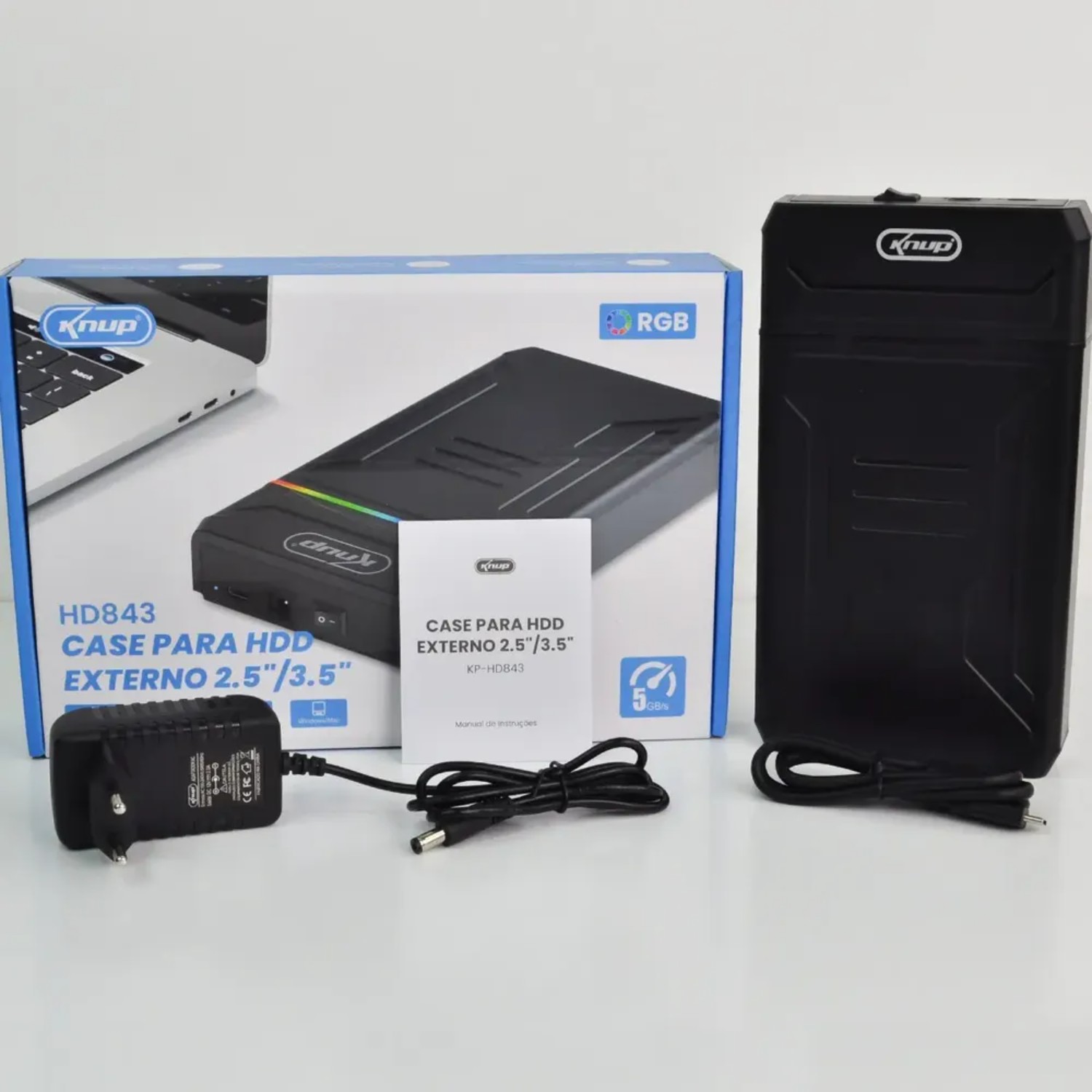 Case Externo Gamer Knup HD843 para HD/SSD 2.5" / 3.5" – Conexão USB 3.0, Até 16TB e Iluminação RGB O Case Externo Knup HD843 é a solução perfeita para expandir seu armazenamento com estilo e desempenho. Compatível com discos rígidos (HDD) de 2,5” e 3,5” e SSDs, ele suporta capacidades de até 16TB, permitindo armazenar grandes volumes de dados sem limitações. Ideal para quem busca uma maneira prática e eficiente de conectar seus discos rígidos externos a PCs e notebooks. Com interface externa USB 3.0 (Type-C) e compatibilidade com SATA I, II, III, esse case oferece transferência de dados rápida e estável, ideal para gamers, criadores de conteúdo e profissionais que precisam de alto desempenho. A instalação é fácil e sem complicação, pois o case não exige parafusos para fixação do disco, oferecendo praticidade no uso diário. Além de sua funcionalidade, o Case Knup HD843 conta com iluminação RGB decorativa oscilante, que agrega um toque moderno e estiloso ao seu setup gamer ou ambiente de trabalho. Com fonte de alimentação de 12V, ele garante um desempenho estável, mesmo com discos de maior capacidade. Características: Compatibilidade de discos: HDD 2,5” e 3,5” / SSDs Capacidade máxima: Suporta até 16TB Interface interna: SATA I, II, III Interface externa: USB 3.0 Type-C Fácil instalação: Sem parafusos para montagem do disco Iluminação RGB: Luz oscilante decorativa para um visual gamer Fonte de alimentação 12V para maior estabilidade Especificações Técnicas: Compatibilidade de sistemas: Win / Mac / Linux Dimensões: Compatível com HDD/SSD de 2,5" e 3,5" Conexão USB: Type-C para fácil conexão com seu PC/Notebook Fonte de alimentação: Inclusa, 12V Cabo USB 3.0 Type-C: Incluso para uma conexão rápida e confiável Itens Inclusos: 1 x Case Externo USB 3.0 para HD SATA 3,5"/2,5" 2EM1 1 x Cabo USB 3.0 (Type-C) 1 x Fonte de Energia 12V 1 x Espuma Anti Vibração para proteção do disco Expanda sua capacidade de armazenamento e adicione um toque de estilo com o Case Externo Knup HD843. Ideal para quem precisa de desempenho, capacidade e praticidade em um único produto.