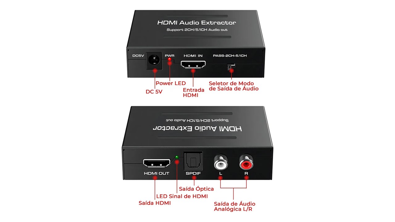 Características: Este decodificador de áudio HDMI pode extrair o áudio digital 5.1 embutido no HDMI e transformá-lo em saída no formato de áudio Óptico digital SPDIF ou analógico (2 RCA LxR) para conexão com um dispositivo externo. O conversor HDMI para HDMI + Óptico Digital ou Áudio Analógico estéreo aumenta as possibilidades de utilização com diversos aparelhos que possuem somente uma saída HDMI. Com ele, você poderá conectar aparelhos como Blu-ray Players, Nintendo Wii U, PS3, PS4, Xbox 360, Xbox One, Receptores de TV a cabo, entre outros equipamentos que tenham somente uma saída HDMI, utilizando em conjunto a saída do extrator HDMI para o vídeo e a Óptica digital ou 2 RCA LxR estéreo para a conexão com aparelhos de som ou Hometheaters. O sinal estéreo analógico pode ser facilmente conectado também a fones de ouvido ou amplificadores de áudio. Especificação: Nome: HDMI para HDMI + Óptico Digital SPDIF + Analógico L/R Auxiliar Fonte de alimentação: DC 5 v/1A Possui indicadores LED Resolução HDMI: 24/50/60fs/1080 p/1080i/720 p/576 p/576i/480 p/480i Formato de vídeo: 24bit/deep cor 30bit, 36bit Saída de áudio: L/R + SPDIF Max largura de banda: 225 mhz Max taxa de transmissão: 6.75 Gbps Entrada/Saída de sinal TMDS: 0.5 1.5 Volts p-p (TTL) Entrada/Saída de sinal DDC: 5 Volts p-p (TTL) Distância do cabo de entrada: =15m AWG26 cabo padrão HDMI Distância do cabo de saída: =20m AWG26 cabo padrão HDMI Max corrente de trabalho: 500mA Formato adaptador de alimentação: Entrada: AC (50 hz, 60 hz) 100 v-240 v; saída: DC5V/1A Faixa de Temperatura de operação: -15 a + 55¿ Gama de Humidade de funcionamento: 5 a 90% RH (Sem Condensação) Tamanho: aprox. 8.5x6x2 cm (L * W * H) 1 x HDMI para HDMI Óptico + SPDIF + RCA L/R Conversor. 1 x Fonte de Alimentação 1 x Manual Do Usuário.
