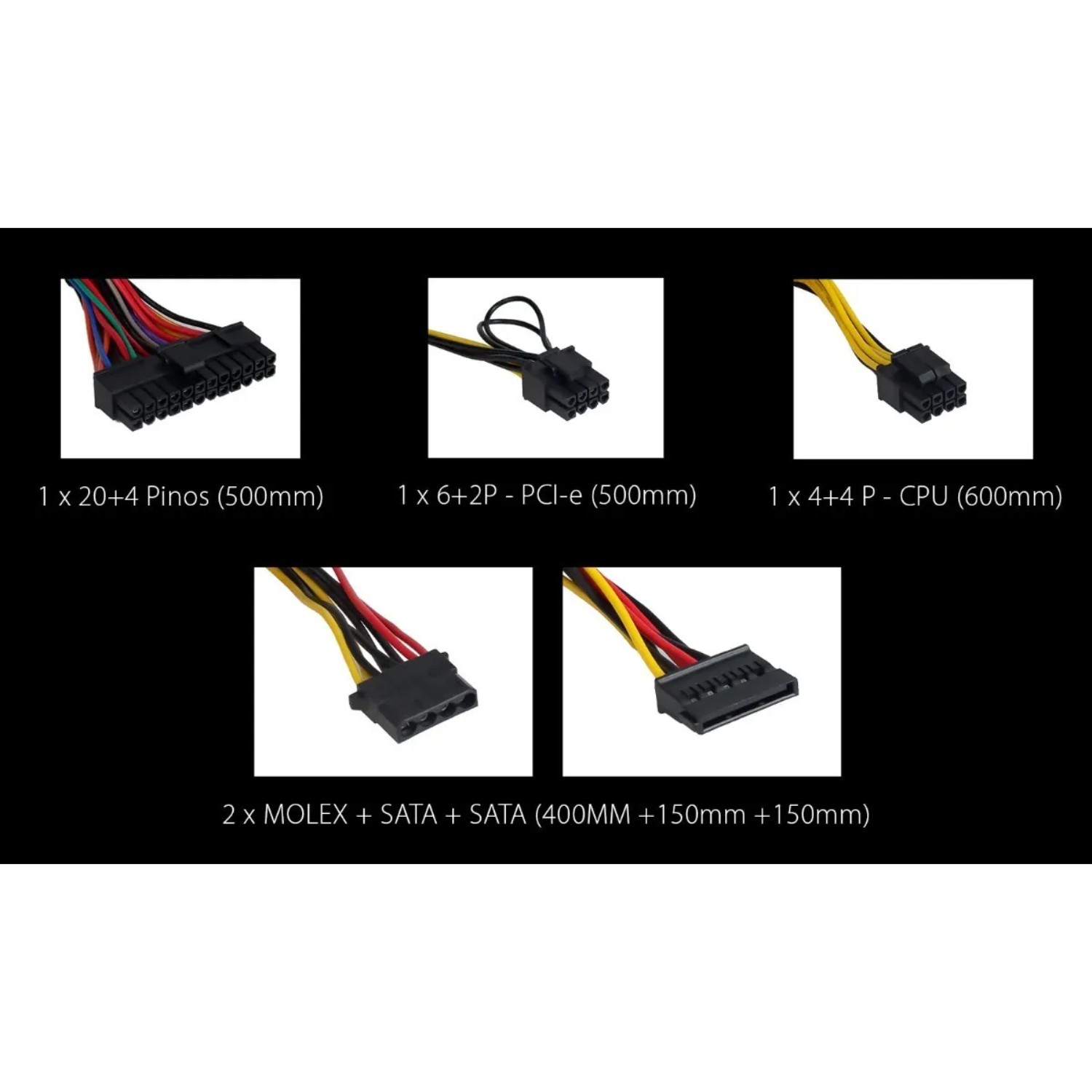 As fontes gamer Dash da Vinik chegaram trazendo desempenho e preço competitivo, garantindo o melhor custo x benefício do mercado. Sua fan de 120mm garante que a fonte trabalhe em uma temperatura estável, fornecendo uma operação eficiente e silenciosa. Utilize a chave seletora para escolher a voltagem correta de acordo com sua rede. Potencia: 600W Tensão de Entrada: 110-230V (chave seletora manual) Fan: 12cm Eficiência: +70% Conectores: 1 x 20+4 Pinos (500mm) 1 x 4+4P - CPU (600mm) 2 x 6+2P - PCI (500mm) 2 x MOLEX + SATA + SATA (400MM+150mm)
