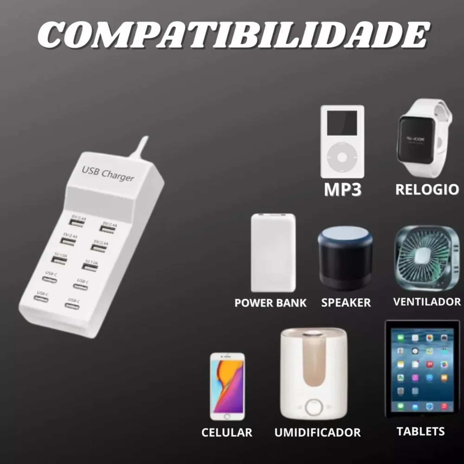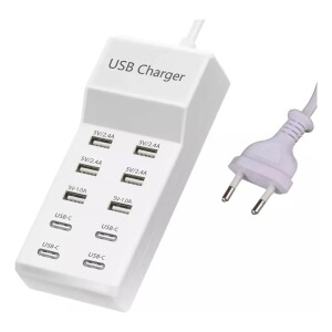 Ampla compatibilidade: Você pode carregar mais do que apenas seu smartphone ou mesa com este prático adaptador de várias portas. Ele também irá ligar seu e-reader, fones de ouvido Bluetooth, alto-falantes portáteis e outros dispositivos que carregam com um cabo USB. 10 portas do carregador USB que oferece um método conveniente para distribuição de energia em aplicações de bancada e montagem no chão. t Conveniente e perfeito para viagens, casa e escritório. (Tensão de entrada: AC 100V-240V). Especificação: 1. Entrada: AC100V ~ 240V, 50/60Hz, 1.5A máximo. 2. Saída: DC5V10A (6USB + 4Type-c) ou (10 USB)