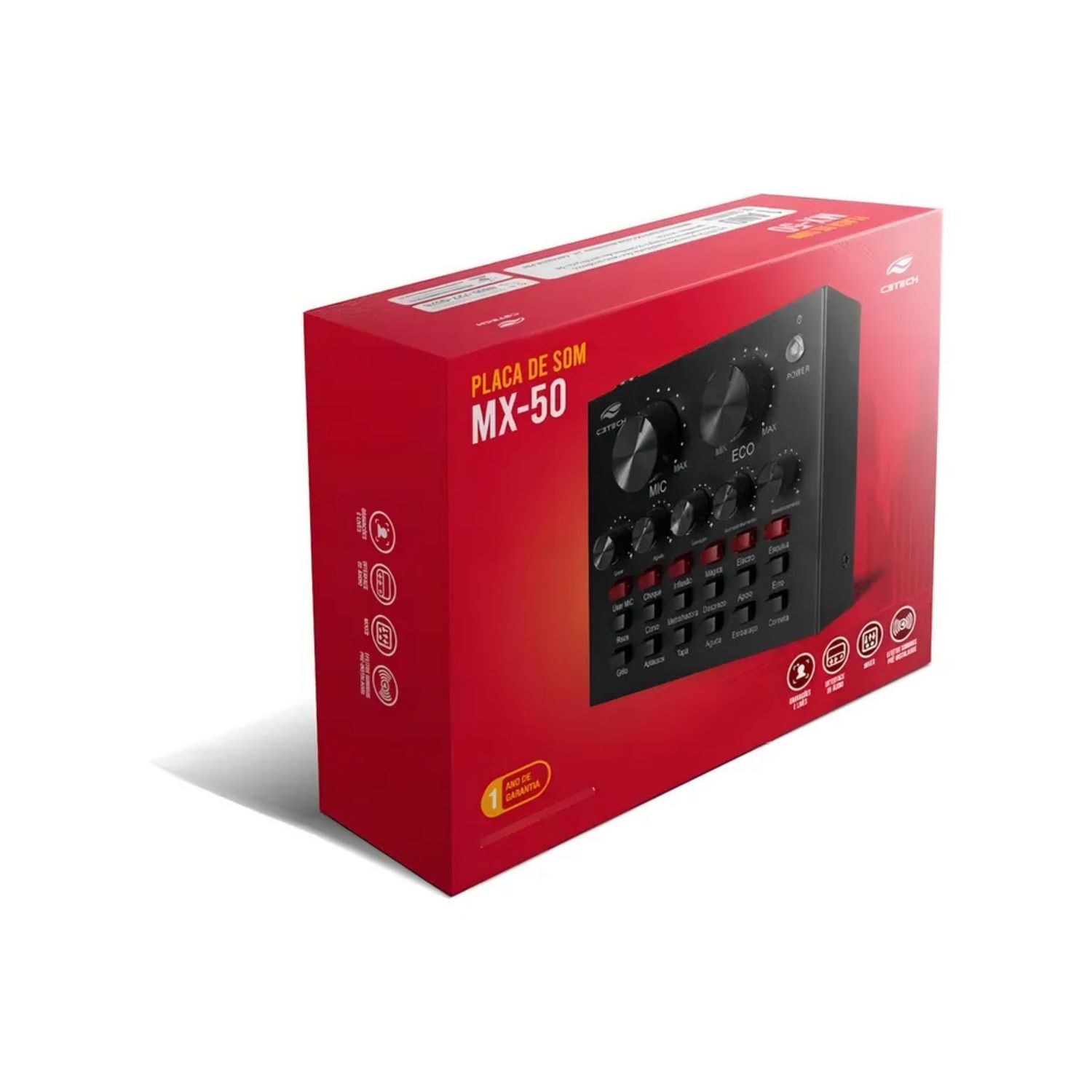 MX-50 da C3TECH e a placa de som que te da o controle na transmissao de video. Libere sua criatividade e faca lives personalizadas na Twitch, YouTube, ou onde for. Equipamento de ampla compatibilidade e facil uso, com 18 efeitos sonoros para tornar sua diversao completa.