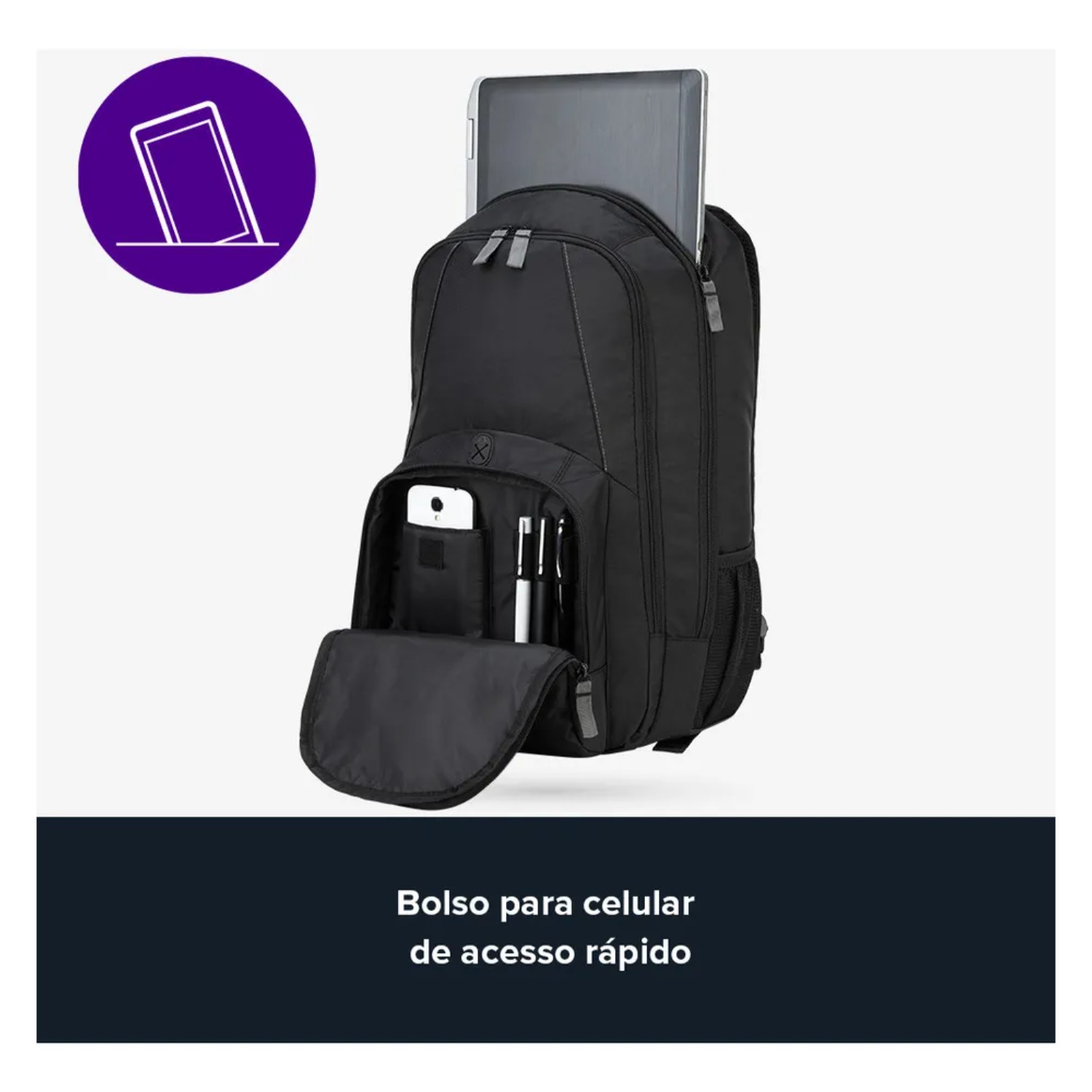 Compatível com notebooks de até 17 polegadas, conta com compartimento acolchoado que protege o equipamento contra impactos e arranhões. Sua capacidade de 27 litros permite transportar documentos, periféricos e objetos pessoais com praticidade.