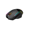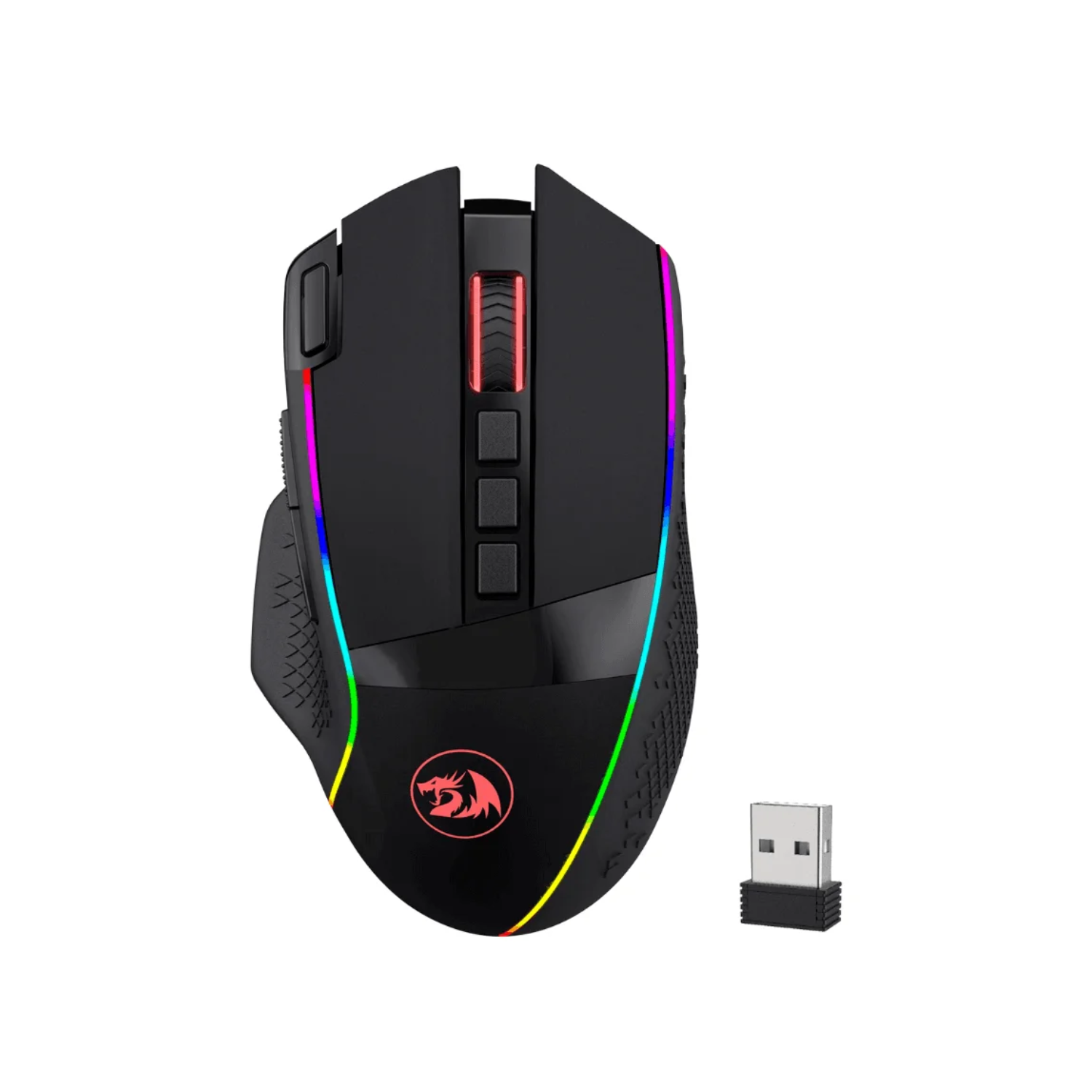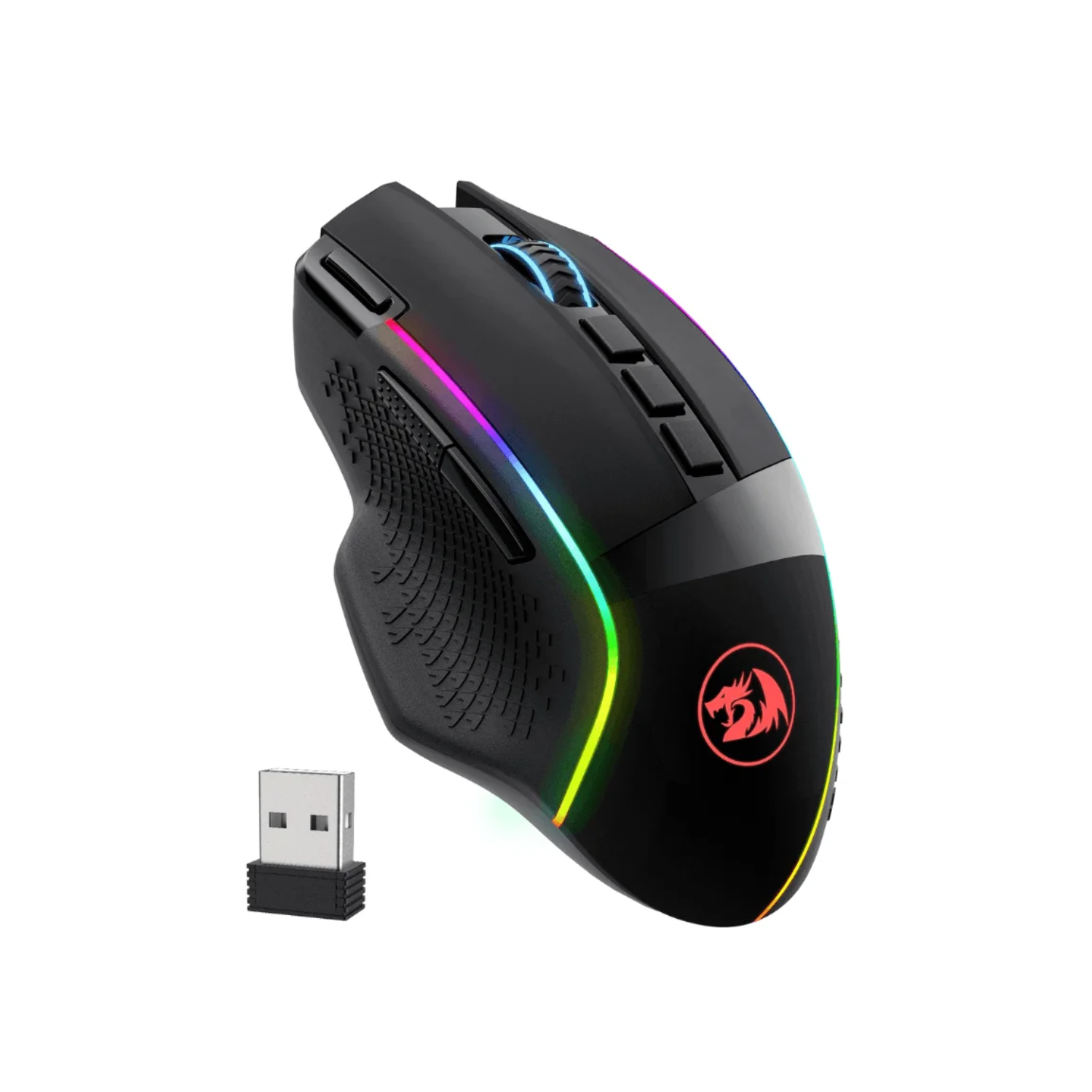 Conta com 9 botões programáveis, incluindo botões laterais e de disparo rápido, totalmente configuráveis via software Redragon Pro para criação de macros, ajuste de DPI e personalização de iluminação RGB, com múltiplos efeitos dinâmicos.