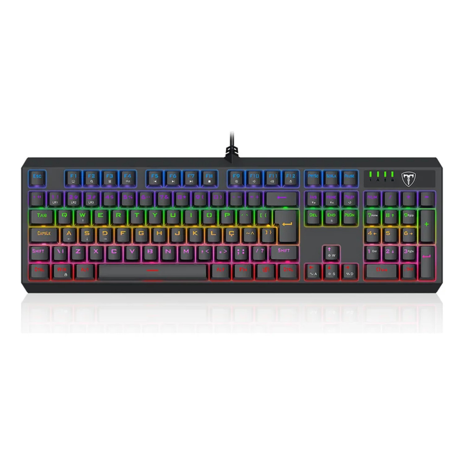 Teclado Membrana Gamer T-Dagger Echo RGB Preto Estrutura reforçada em metal dando mais rigidez e durabilidade Iluminação RGB trazendo mais brilho para seu setup Atalhos multimídia trazendo mais praticidade durante o uso 19 teclas com rollover para não causar interrupções durante o gameplay Descrição do produto: Características: - marca: t-dagger - modelo: t-tgk109 especificações: - acionamento: membrana - cor: preto - formato: full size - layout: abnt2 - conectividade: usb - software: não - altura ajustável: sim - design: teclas flutuantes - materiais do case: plástico abs, metal - iluminação: rgb - rollover: 19 teclas (q,a,z,w,s,x,e,d,c,b,space,?,?,?,?,tab,alt-l/v,ctrl-l/f,shift-l.) - peso líquido (g): 80 conteúdo da embalagem: - teclado gamer