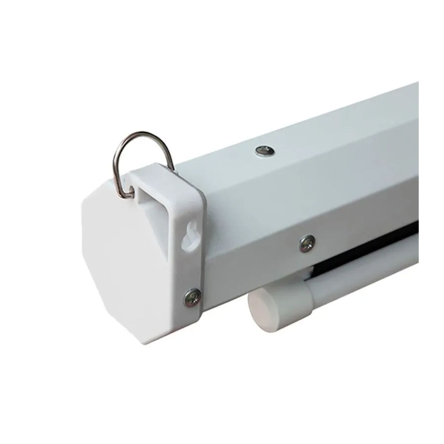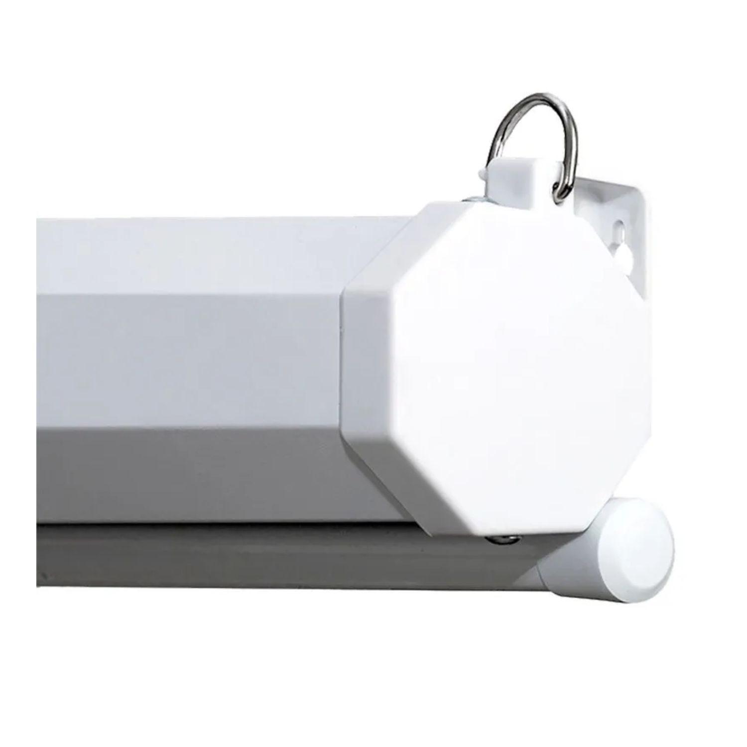 O estojo metálico, fabricado em aço carbono com resistente pintura eletrostática, protege a tela, assegurando maior durabilidade. A tela conta com acionamento manual e enrolamento automático, facilitado por um sistema de mola interna.