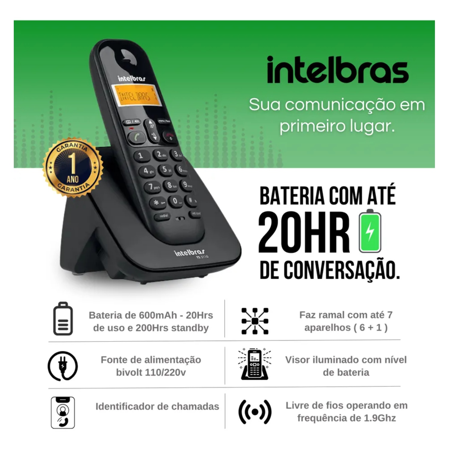 Capacidade para até 7 ramais (base + 6 ramais)* Agenda para 70 contatos Discagem rápida para até 10 números Registro de 15 chamadas atendidas, 20 não atendidas e 15 originadas 7 tipos de toque Funções Flash, Rediscar e Mudo Menu trilíngue em português, espanhol e inglês Eco Mode, para redução do consumo de energia Bloqueio de chamadas originadas Comunicação interna, conferência a três e transferência de chamadas* *Funções realizáveis somente entre telefones Intelbras das séries TS 31, TS 40 e TS 60